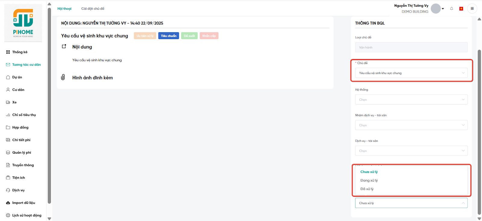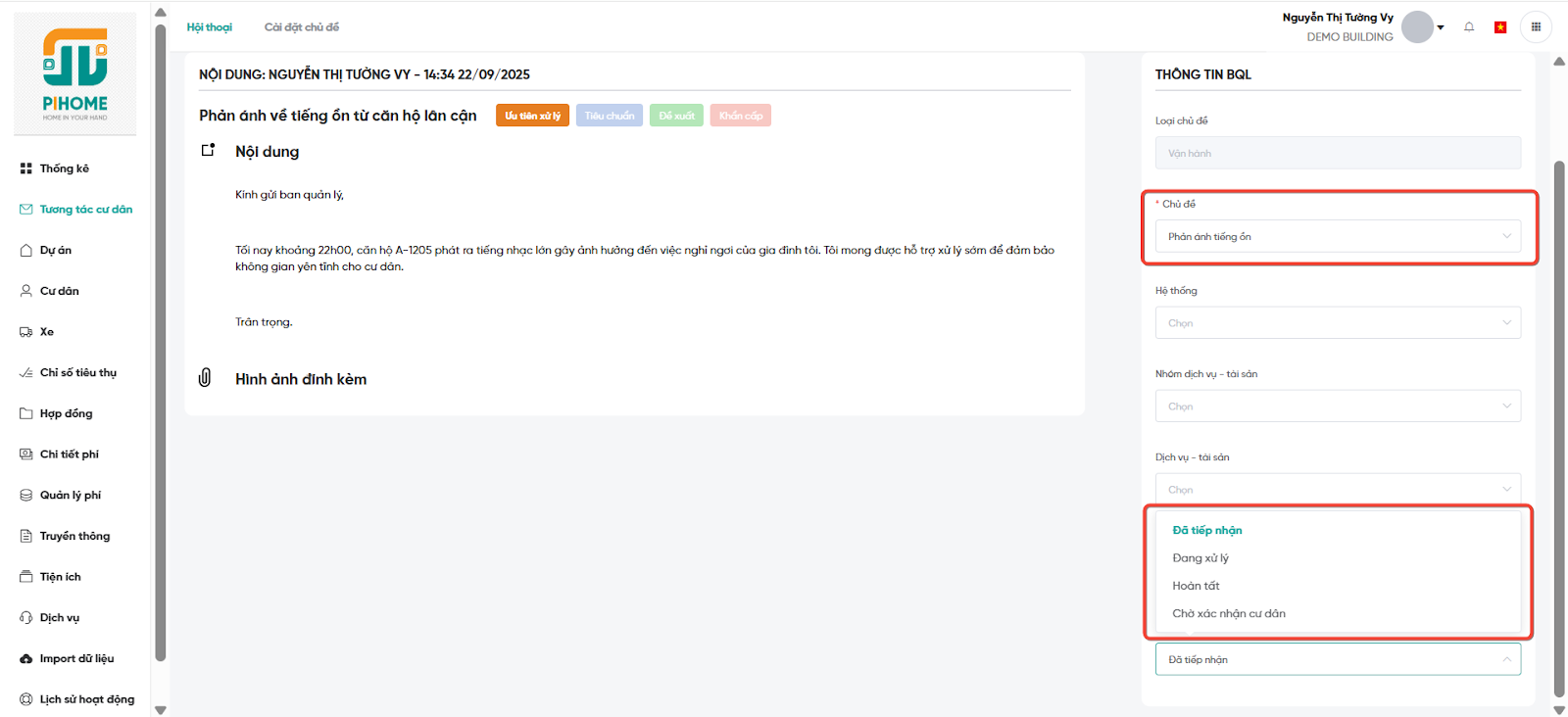 Nếu cư dân chọn chủ đề này để mở hội thoại, phần Tình trạng sẽ xuất hiện đúng theo các trạng thái đã được cài đặt.