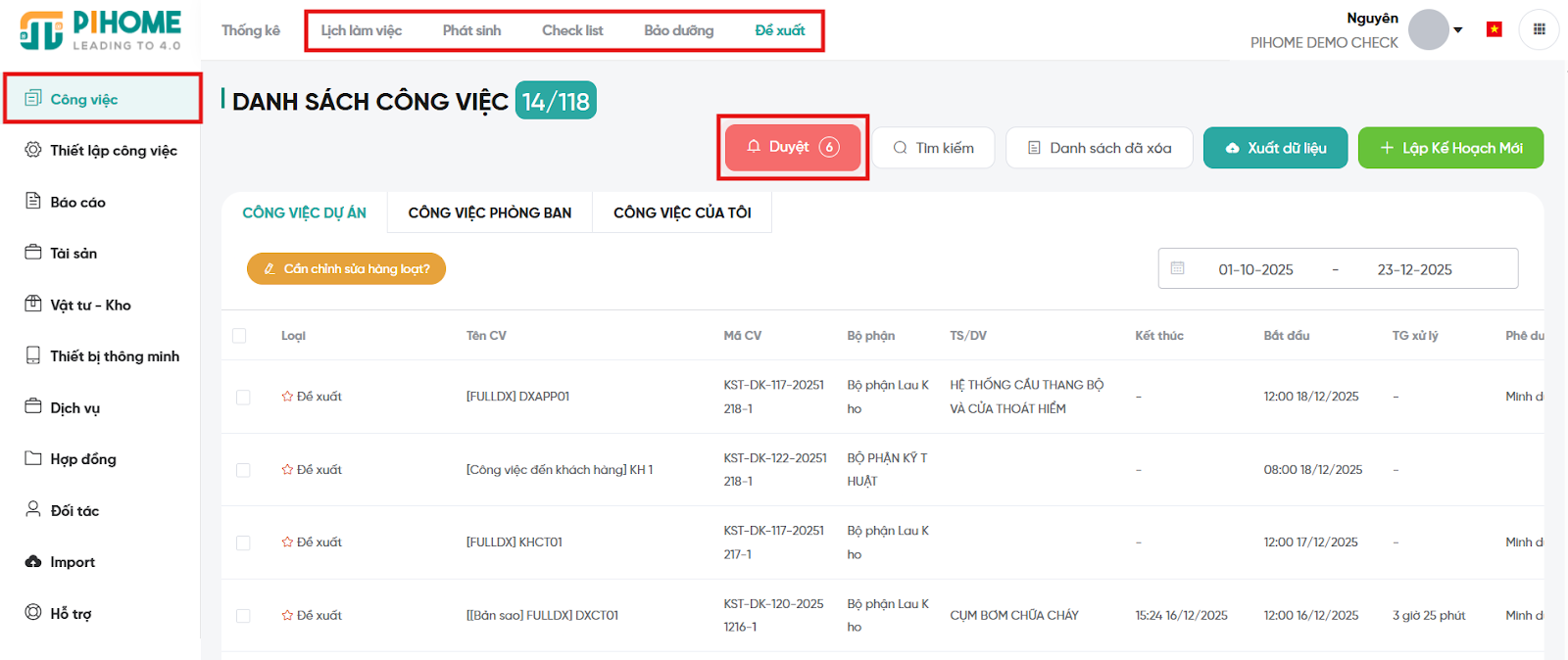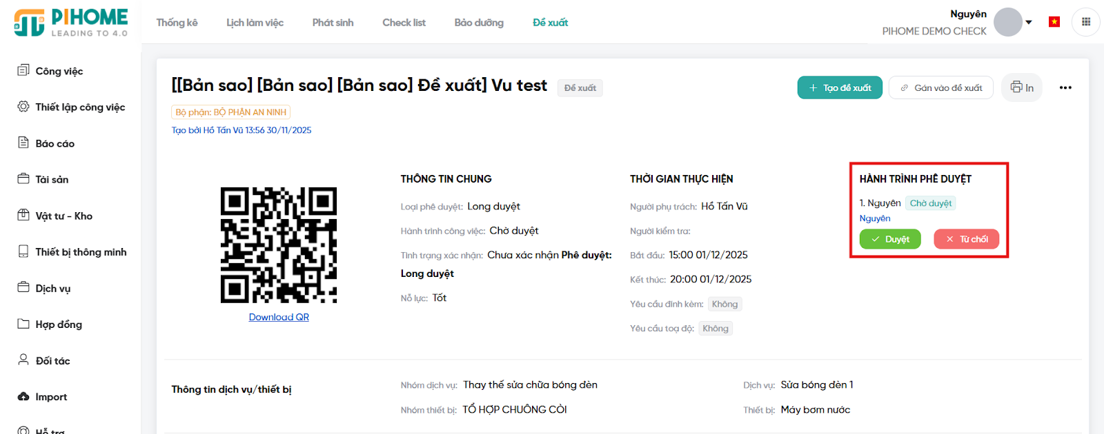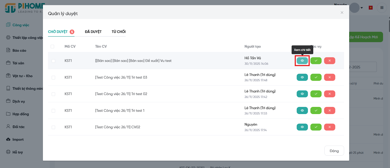 - Thực hiện phê duyệt trực tiếp tại danh sách hoặc tại màn hình chi tiết công việc.