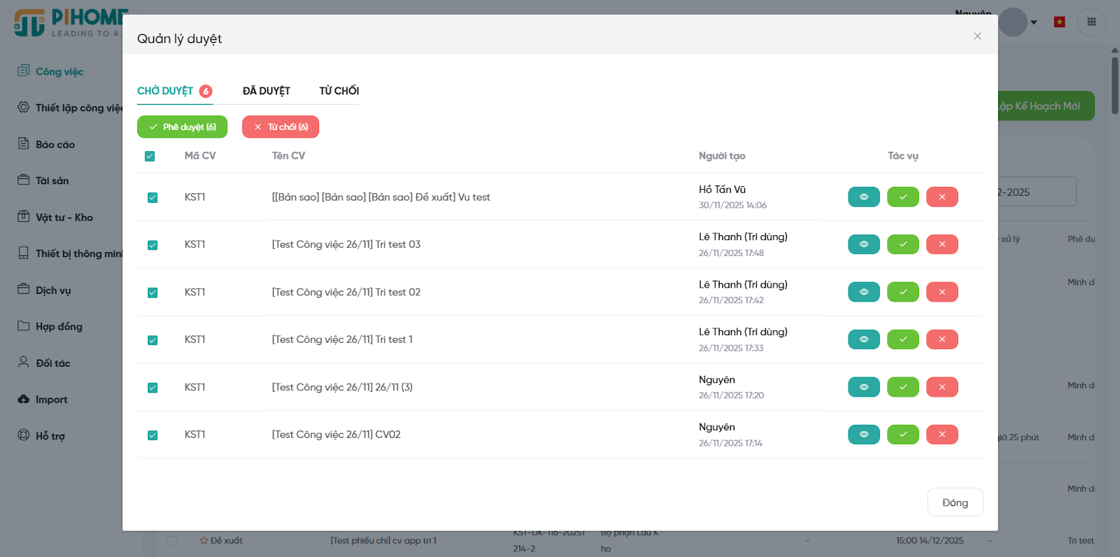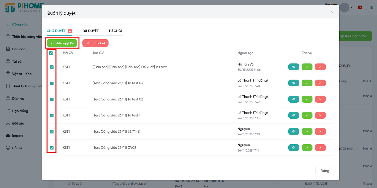 - Phê duyệt hoặc từ chối từng công việc, hoặc duyệt hàng loạt nhiều công việc cùng lúc.