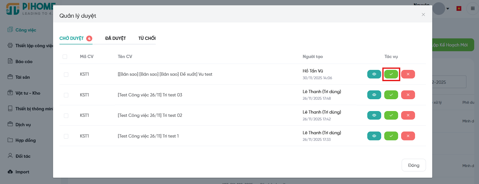 - Duyệt từng công việc: Bấm nút “Phê duyệt”