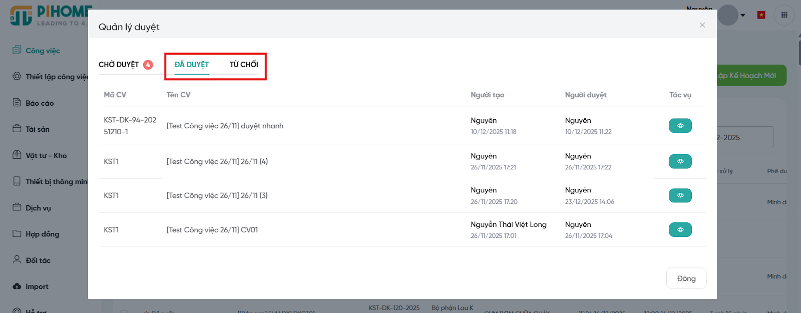 Sau khi được phê duyệt hoặc từ chối, công việc sẽ được hệ thống tự động chuyển sang danh sách trạng thái tương ứng để theo dõi và quản lý.