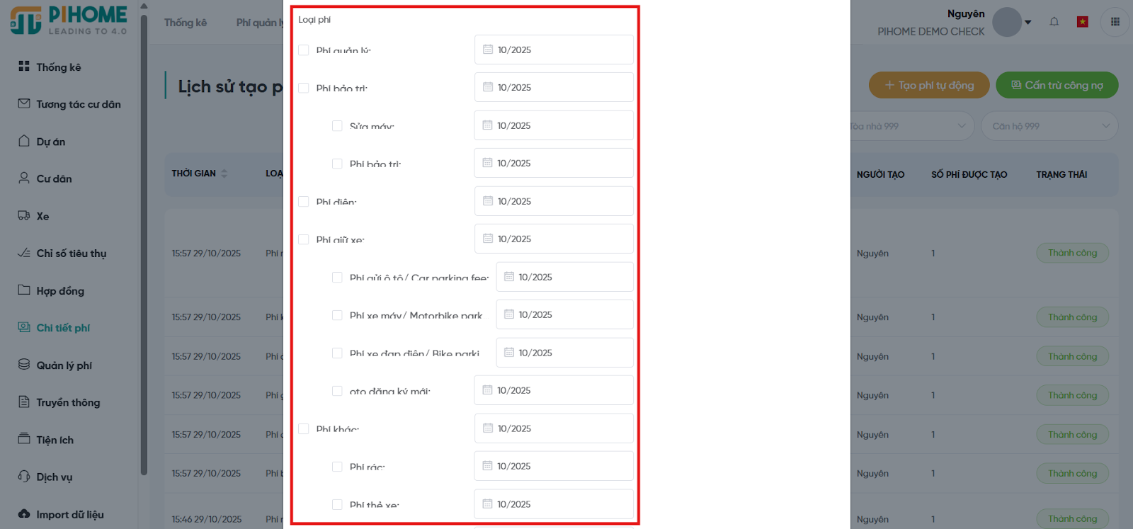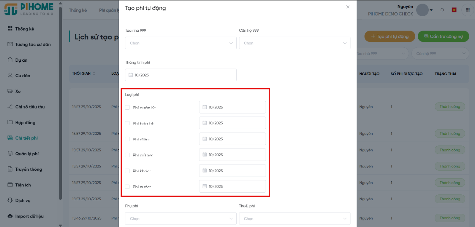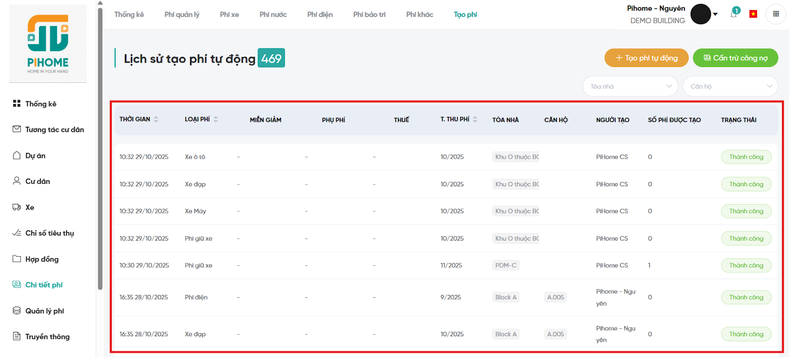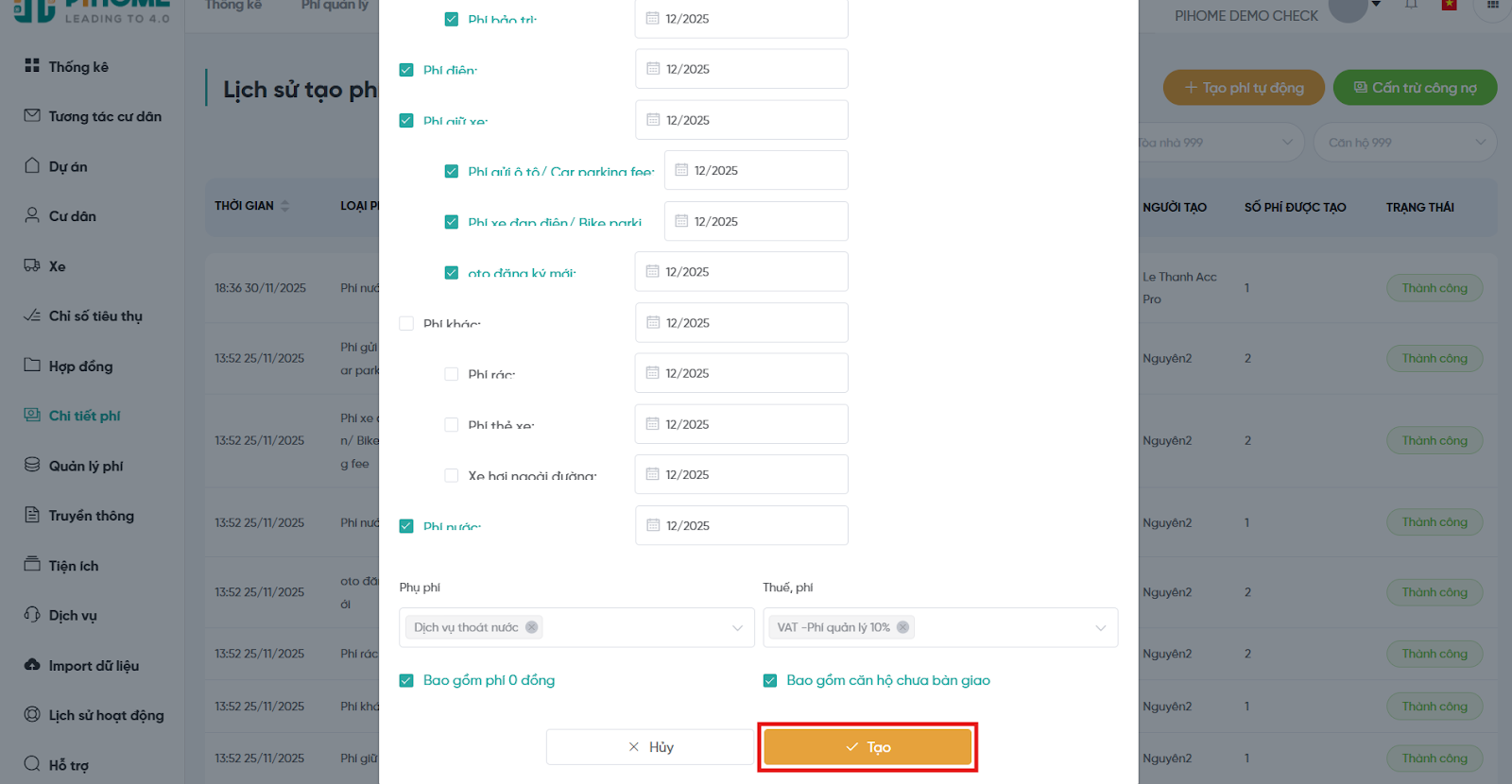 Bước 3: Sau khi hoàn tất, nhấn “Tạo” để hệ thống xử lý. Các khoản phí sẽ được sinh tự động và hiển thị trong mục “Lịch sử tạo phí tự động”.