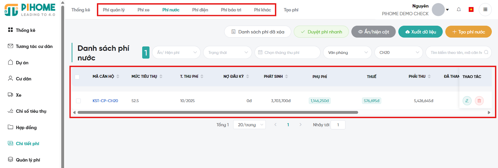 Hệ thống tự động ghi nhận phí vào các tab tương ứng trong “Chi tiết phí” (Phí quản lý, Phí điện, Phí nước…).