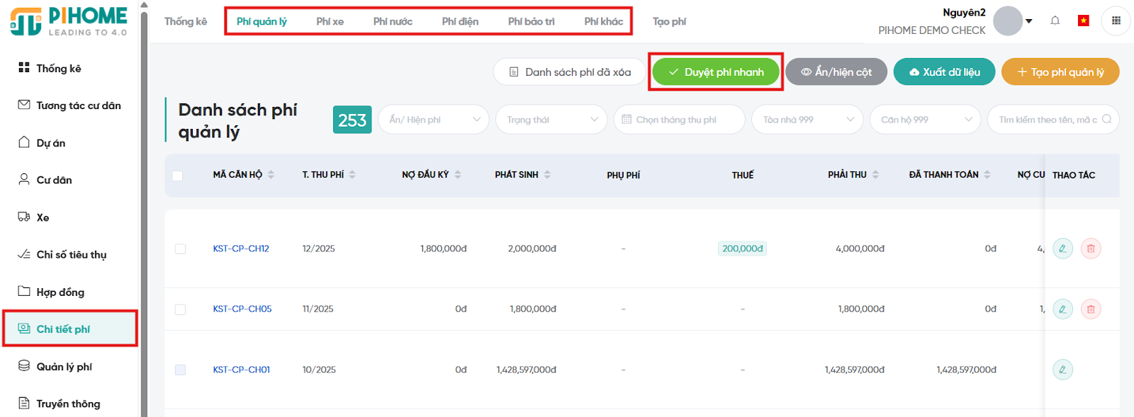 Bước 1: Tại phân hệ “Quản lý” → Vào “Chi tiết phí” trên thanh sidebar bên trái → Vào từng loại phí → Nhấn “Duyệt phí nhanh”.