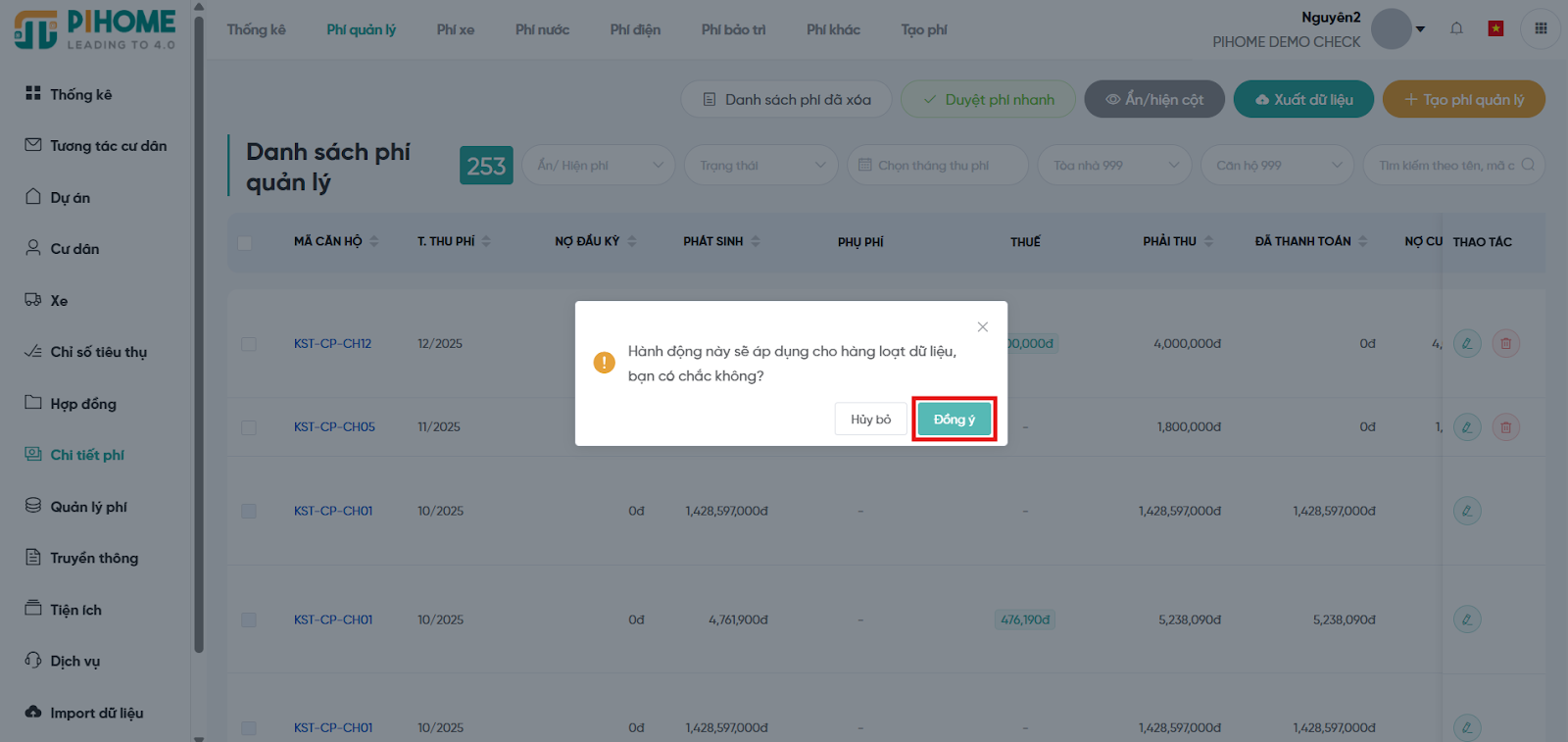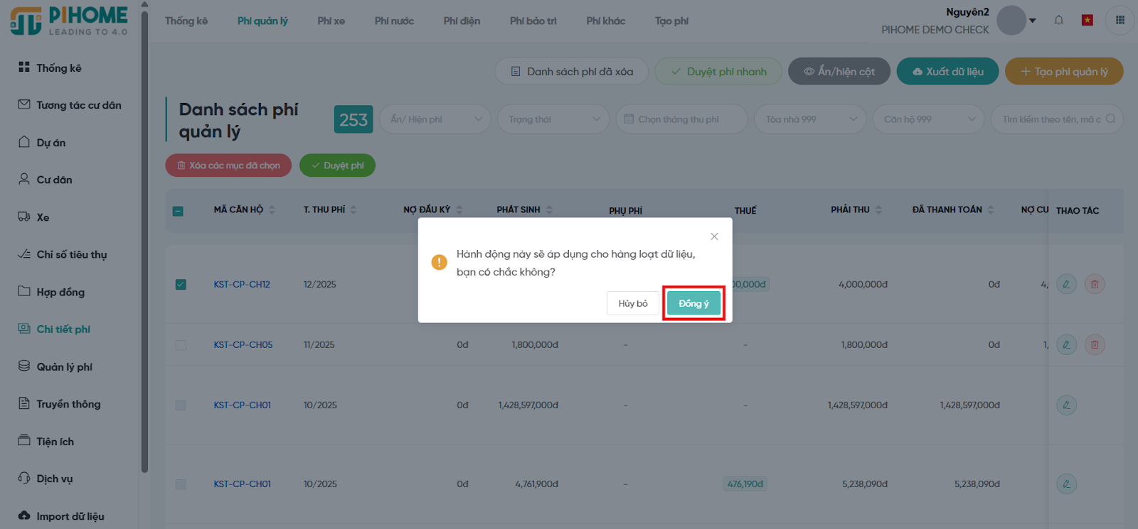 Bước 2: Người dùng có thể chọn “Đồng ý” để duyệt phí hoặc “Hủy” để hủy thao tác. Sau khi chọn “Đồng ý”, toàn bộ phí trên danh sách sẽ được duyệt.