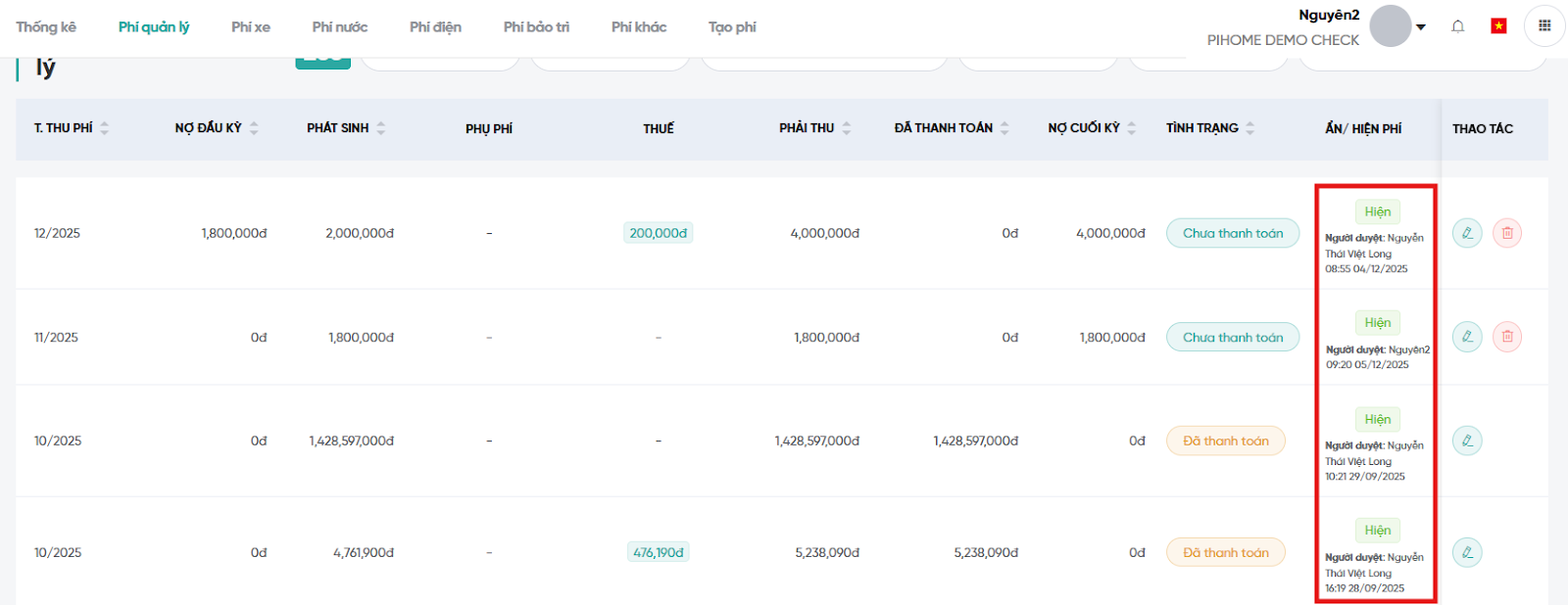 Dòng phí được duyệt sẽ hiển thị người duyệt, ngày + giờ đã duyệt.