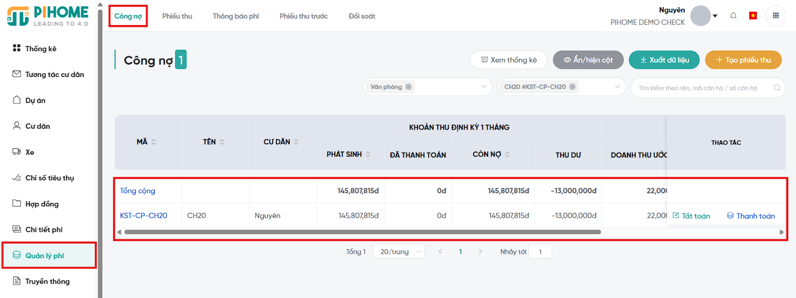 Cũng như cập nhật công nợ cho căn hộ đó tại mục “Quản lý phí” → “Công nợ”.