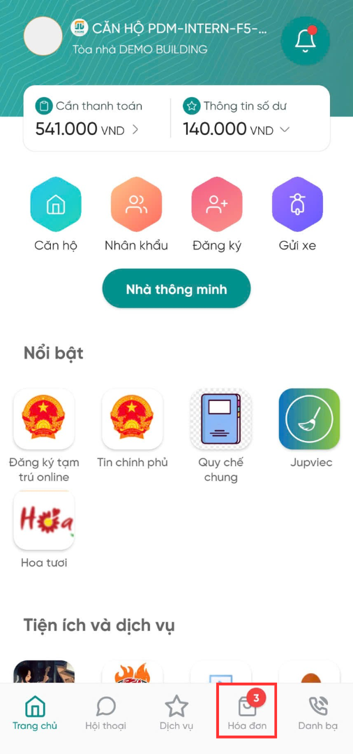 Bước 1: Cư dân đăng nhập app. Tại màn hình “Trang chủ”, cư dân chọn “Hóa đơn”.
