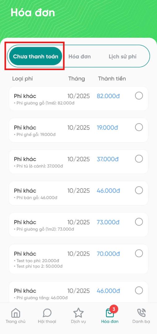 Bước 2: Tại đây người dùng nhấn vào "Chưa thanh toán" để xem những khoản phí cần thanh toán.