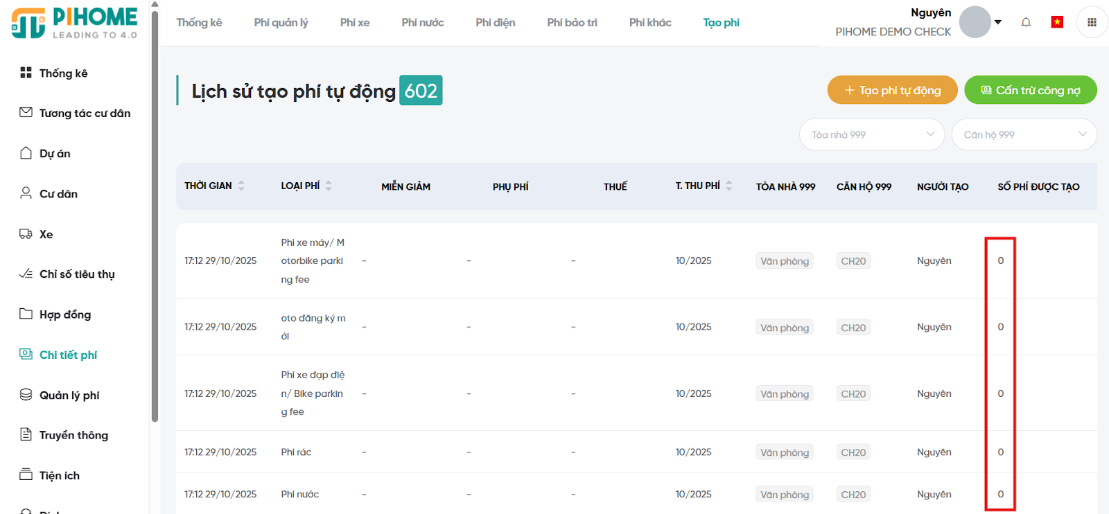Sau khi điều chỉnh xong: Vào Chi tiết phí → Tạo phí tự động để kiểm tra.