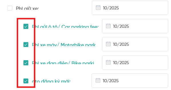 Ngược lại, nếu muốn hệ thống tạo phí cho tất cả các loại xe (ô tô, xe máy, xe đạp...), bạn cần tích chọn thủ công từng loại phí con trong danh sách.