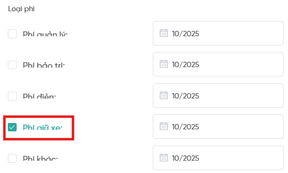 - Nếu tích chọn phí lẻ (ví dụ: Phí xe máy, Phí ô tô,...) → Hệ thống chỉ tạo đúng các khoản phí bạn đã chọn.