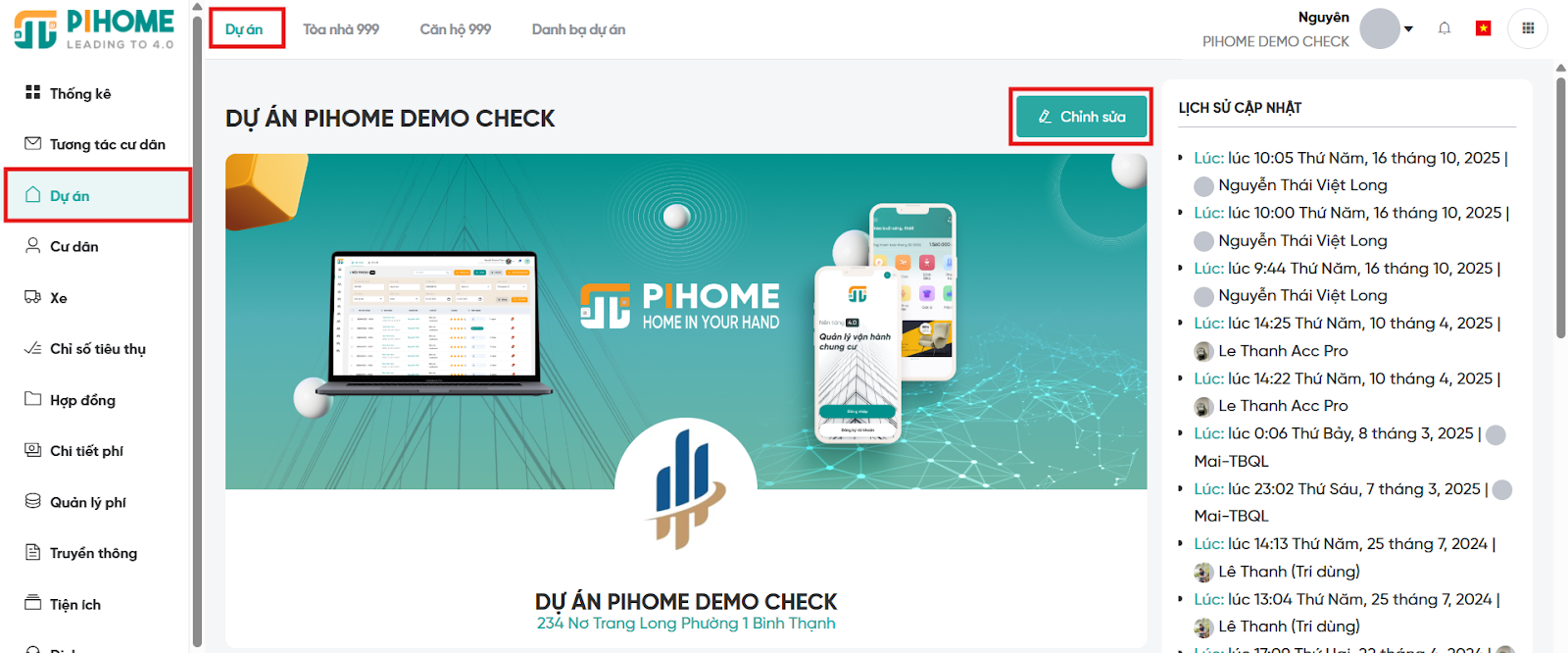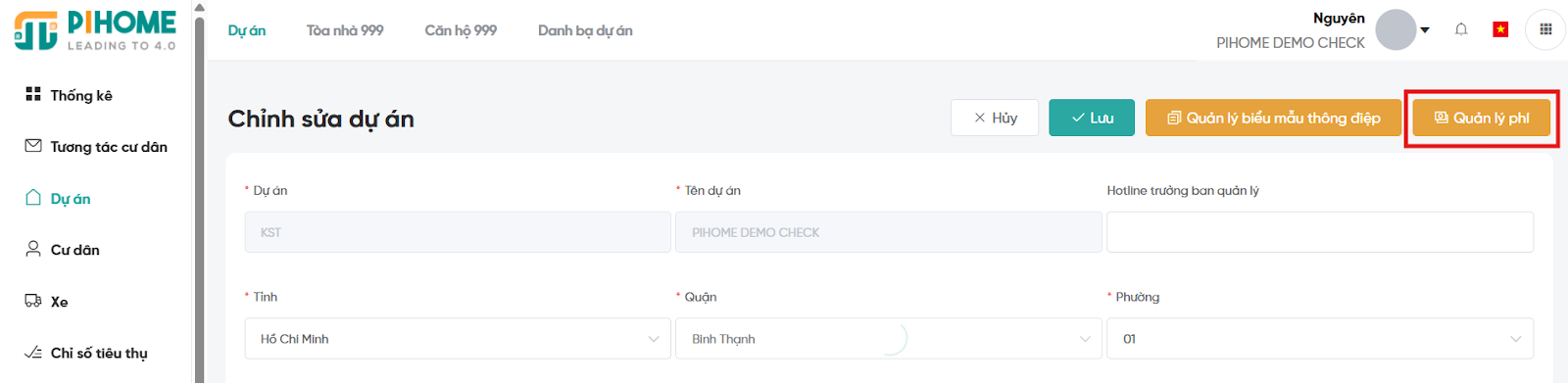 Bước 1: Truy cập: Dự án → Chỉnh sửa → Quản lý phí.