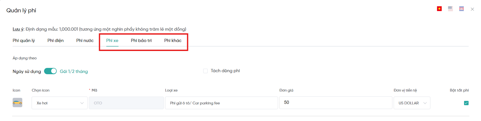 Bước 2: Chọn tab tương ứng (Phí xe, Phí bảo trì, hoặc Phí khác).