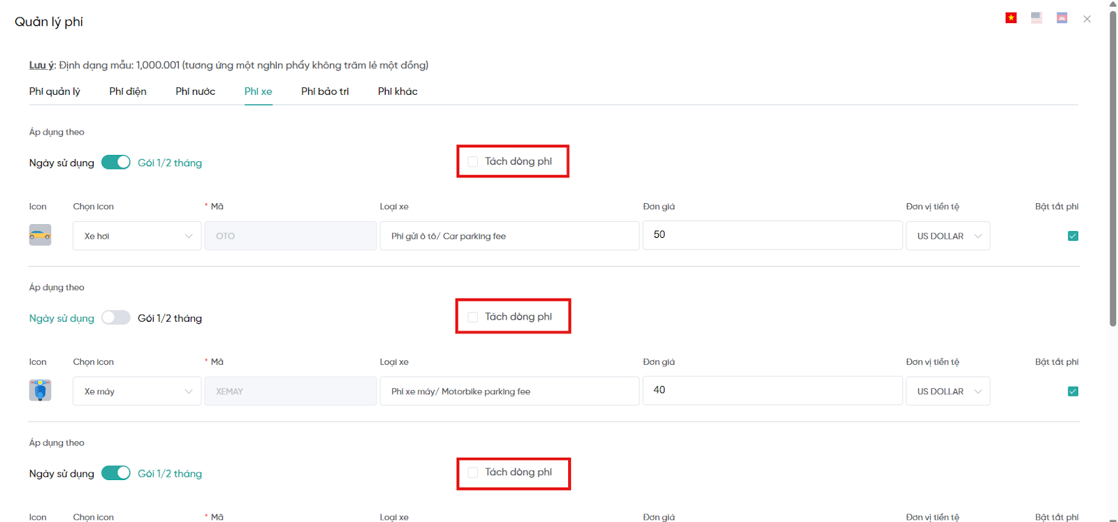 - Nếu tích chọn phí tổng (ví dụ: Phí gửi xe) → Hệ thống chỉ tạo phí cho những loại phí con đang ở trạng thái TẮT “Tách dòng phí”.