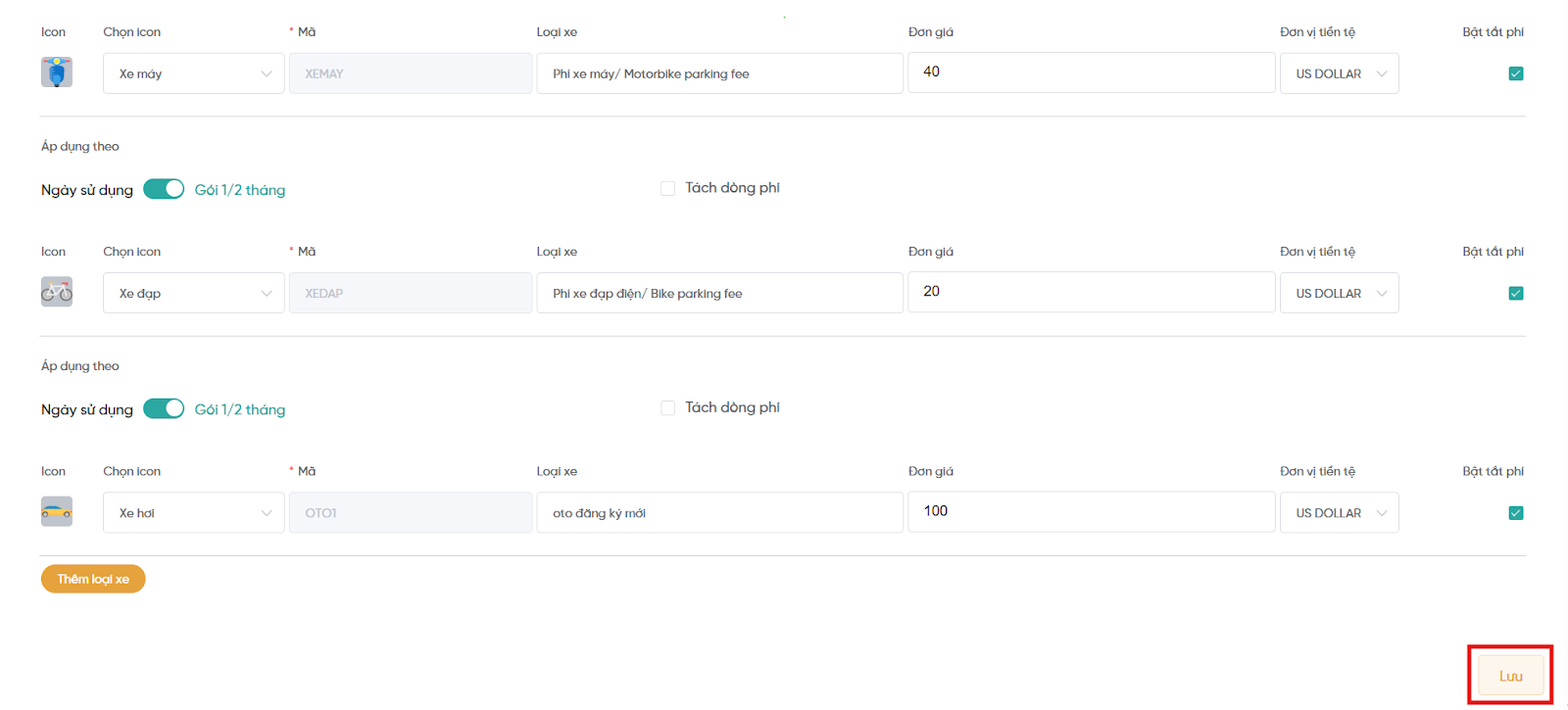 Nếu bạn chỉ tích “Phí gửi xe” mà không chọn từng loại xe cụ thể, hệ thống sẽ chỉ tạo 2 khoản phí ứng với 2 loại xe đang tắt “Tách dòng phí”.