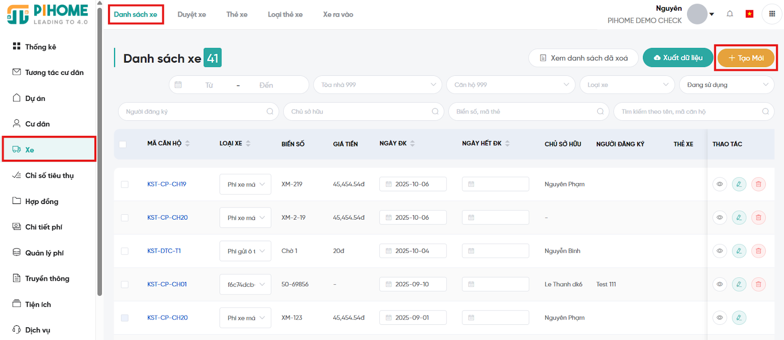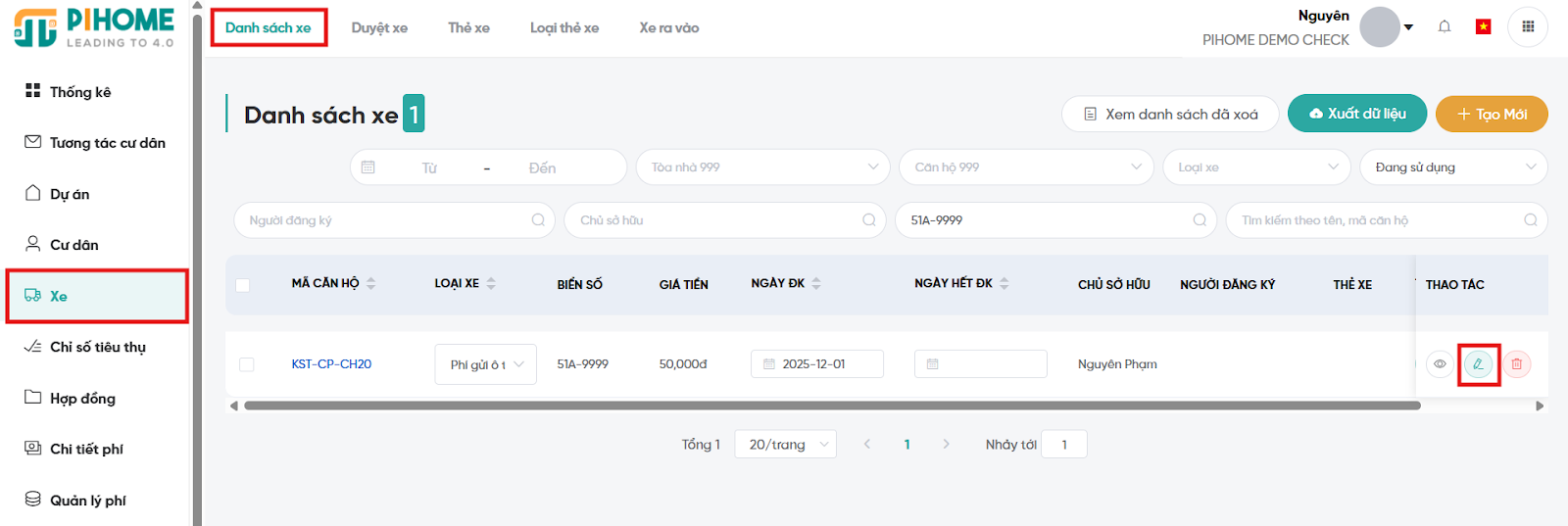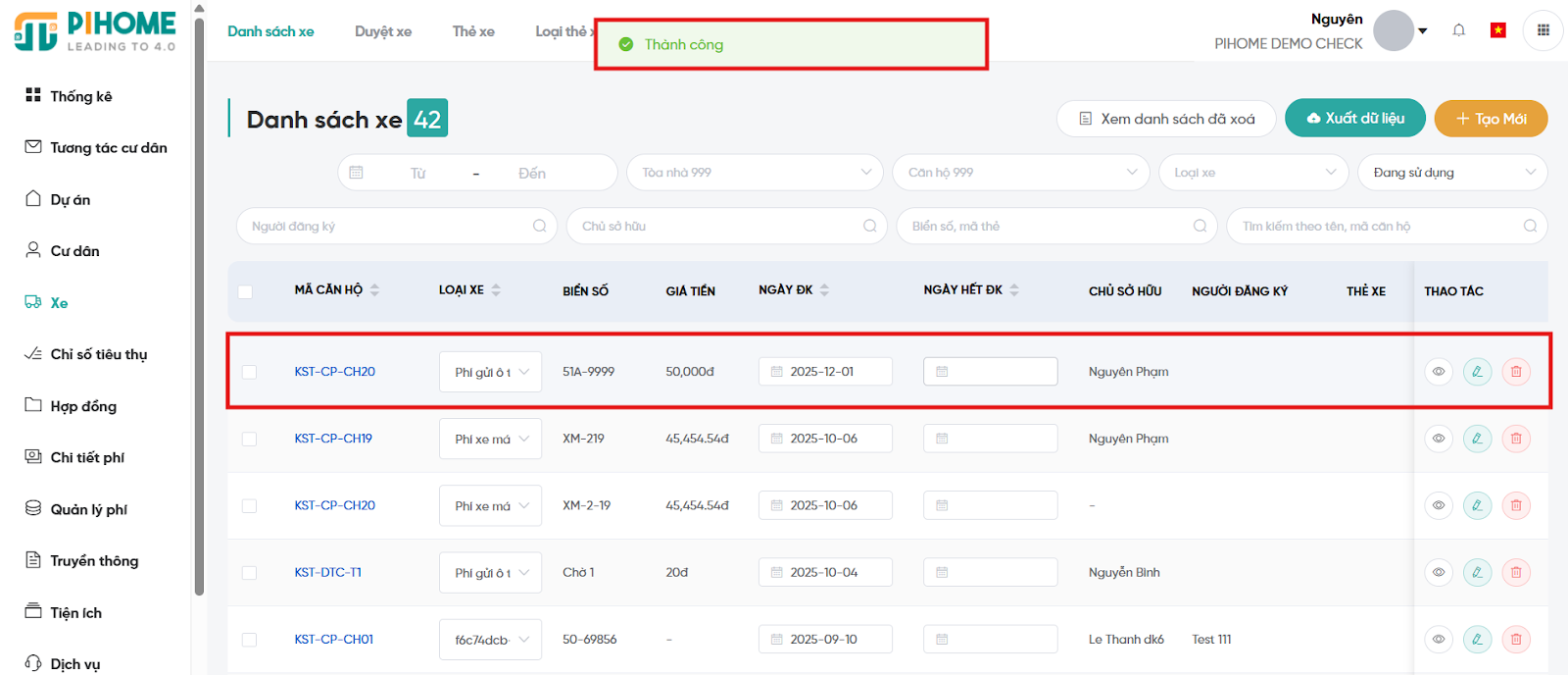 Sau khi tạo thành công, thông tin xe sẽ hiển thị trong danh sách quản lý xe. BQL có thể chọn “Xem chi tiết”, “Chỉnh sửa”, “Xóa”.