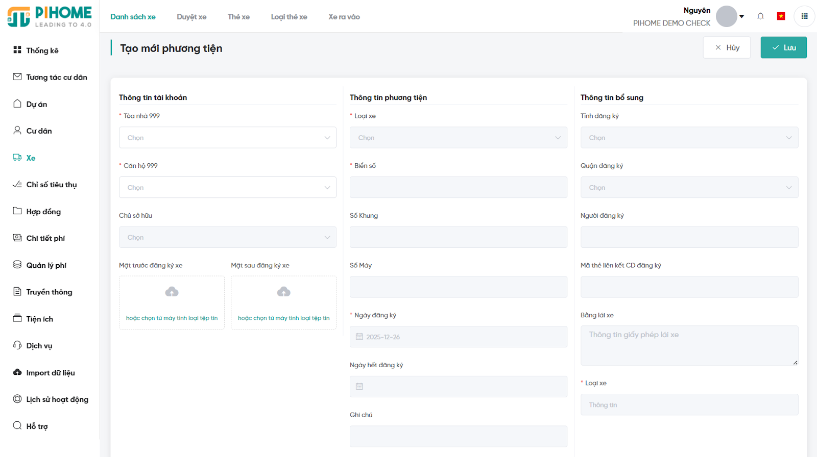Bước 2: Tại giao diện tạo mới phương tiện, BQL nhập/chọn thông tin cần thiết của phương tiện.