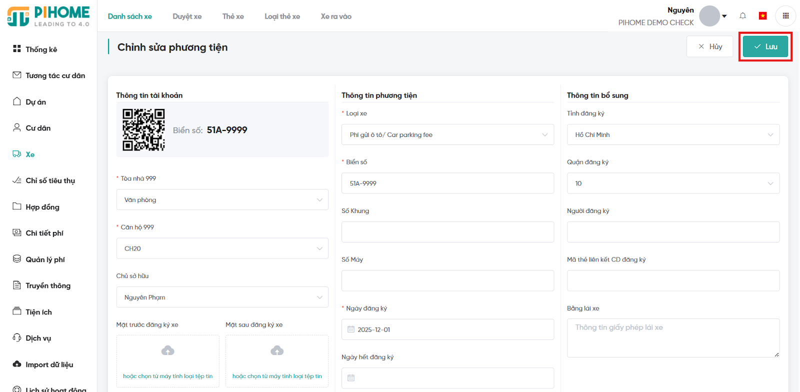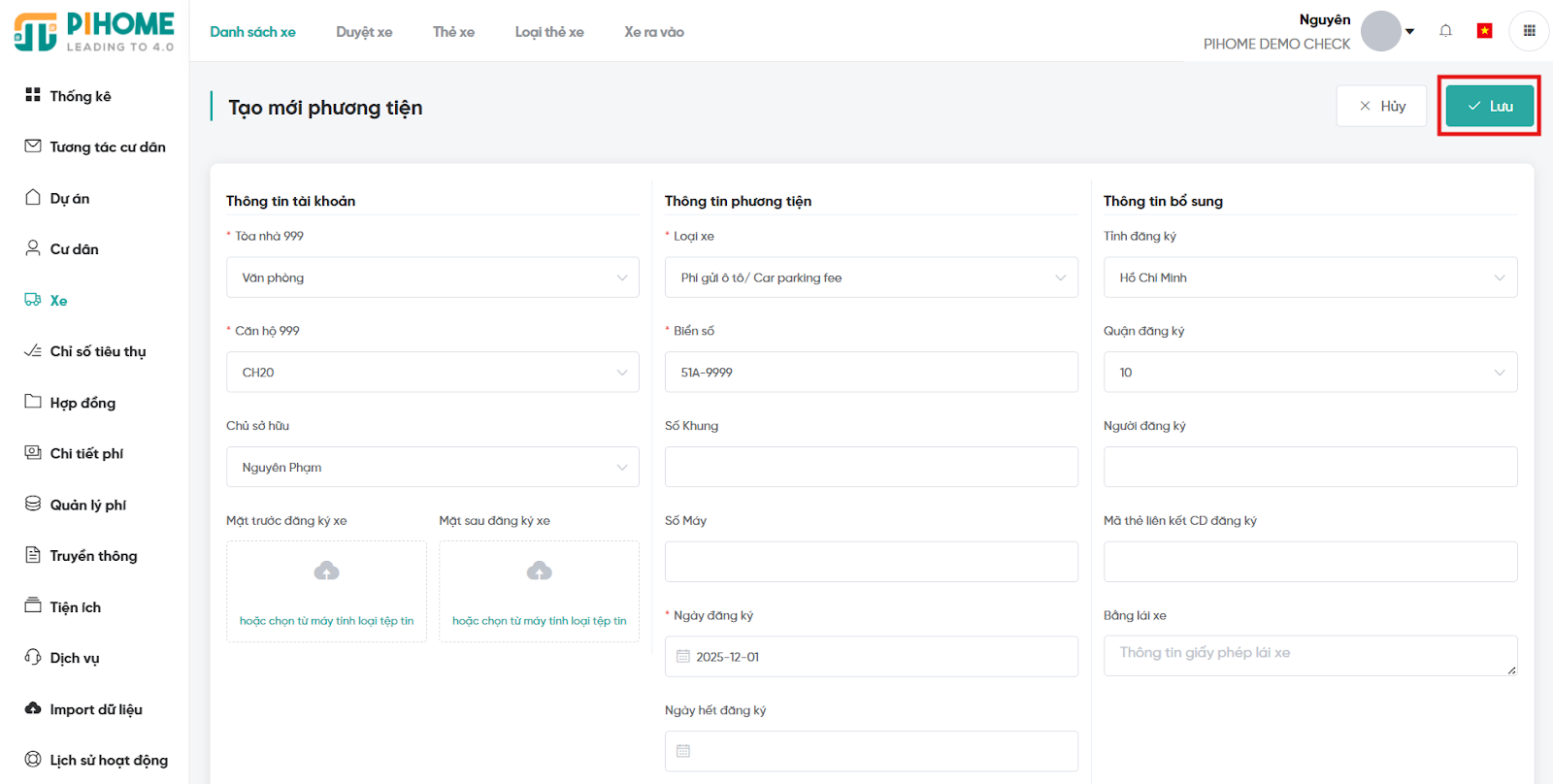 Bước 3: Kiểm tra thông tin, bấm “Lưu” để hoàn tất quy trình thêm phương tiện mới.