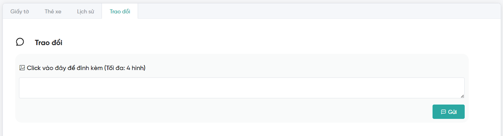 - Trao đổi: Gửi/nhận trao đổi liên quan đến phương tiện, hỗ trợ đính kèm nội dung/hình ảnh để làm rõ thông tin.