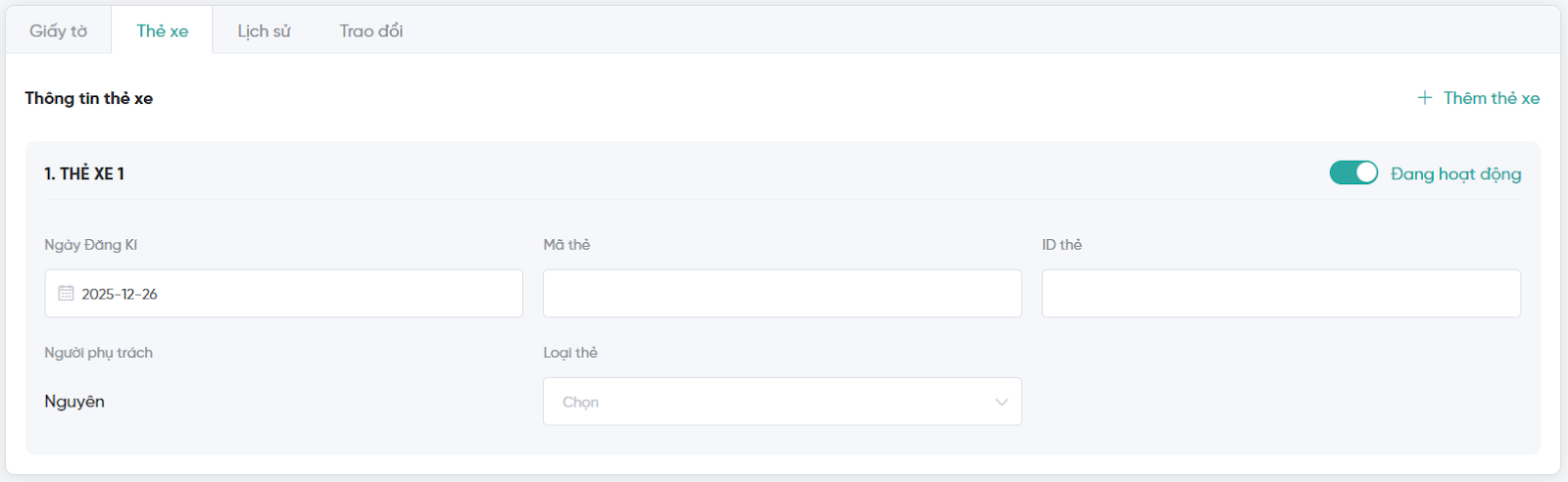 - Thẻ xe: Thêm, sửa, bật/tắt thẻ xe của phương tiện (trạng thái hoạt động và các thông tin liên quan theo cấu hình dự án).