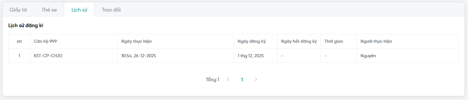 - Lịch sử: Theo dõi lịch sử đăng ký/biến động thông tin xe theo từng thời điểm.