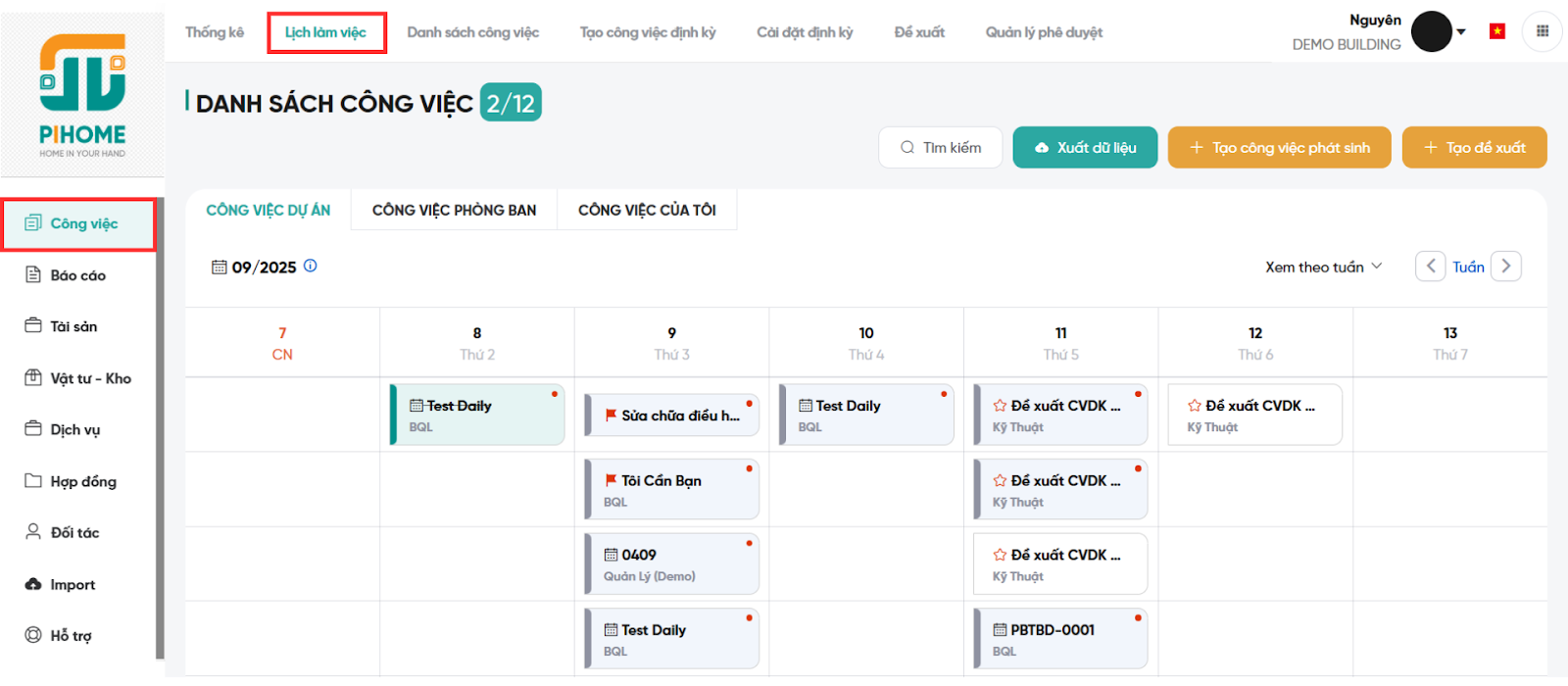 Quản lý lịch làm việc là chức năng thuộc phân hệ vận hành. Với chức năng này người dùng có thể xem các công việc định kỳ và phát sinh cần làm dưới dạng lịch theo tuần hoặc tháng. Hiển thị công việc của dự án, phòng ban, nhân sự ở dạng lịch, có thể truy cập vào để thực hiện các thao tác: tìm kiếm, xuất dữ liệu, tạo công việc phát sinh, công việc đề xuất, thực thi công việc, in các form báo cáo khi cần.