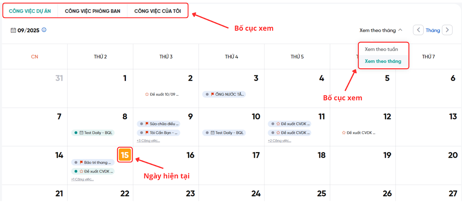 Mặc định hiển thị dạng Tuần với lưới 7 cột (từ Chủ nhật → Thứ 7). Mỗi cột ghi ngày ở đầu, có nền vàng đánh dấu ngày hiện tại. Trên cùng có 3 phạm vi lọc: Công việc dự án/Công việc phòng ban/Công việc của tôi. Góc phải có “Xem theo tuần” (dropdown để đổi chế độ xem: Tuần, Tháng) và mũi tên qua tuần trước/tuần sau; có thể theo dõi tháng/năm hiện tại (ví dụ 09/2025).