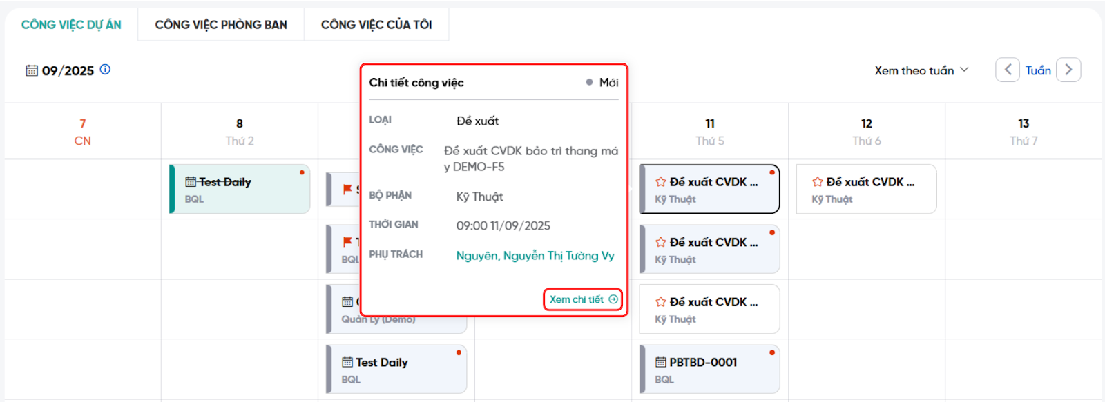Công việc được hiển thị dưới dạng thẻ trong ô ngày: thấy tiêu đề, bộ phận/phân quyền và các biểu tượng thể hiện loại/trạng thái. Muốn xem thông tin chi tiết công việc, người dùng nhấn vào mục công việc đó → “Xem chi tiết”.
