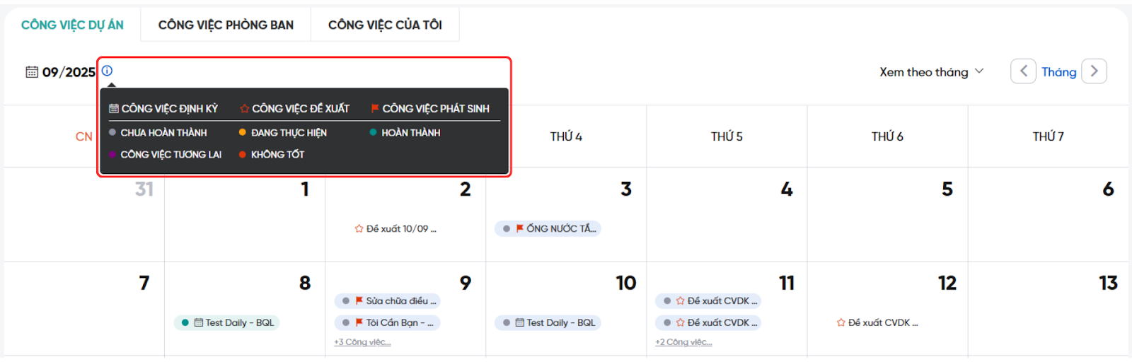 Có thể xem định nghĩa các biểu tượng tại dấu chấm than nhỏ kế ô tháng/năm, bao gồm loại công việc: định kỳ, đề xuất, phát sinh; và kết quả công việc: chưa hoàn thành, đang thực hiện, hoàn thành, công việc tương lai, không tốt.