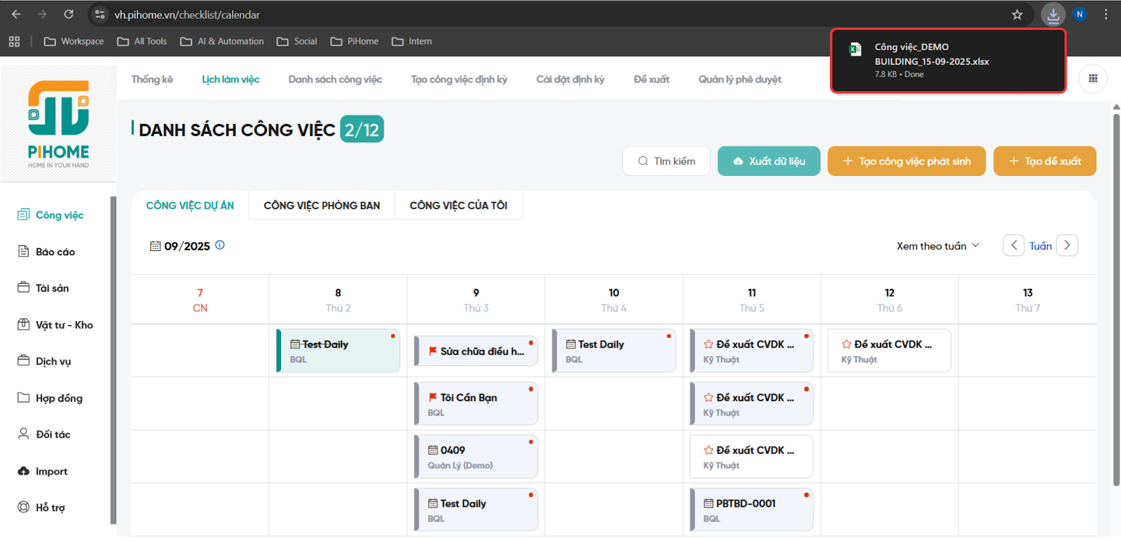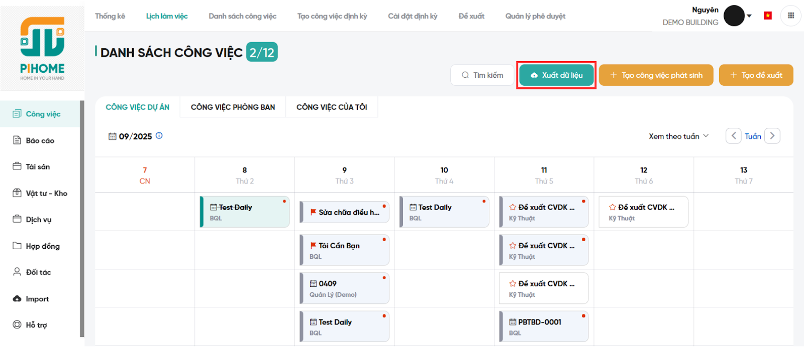 Tại danh sách công việc, nếu người dùng muốn tải lịch làm việc về máy, chọn “Xuất dữ liệu” → Danh sách công việc tải về máy dưới dạng excel.