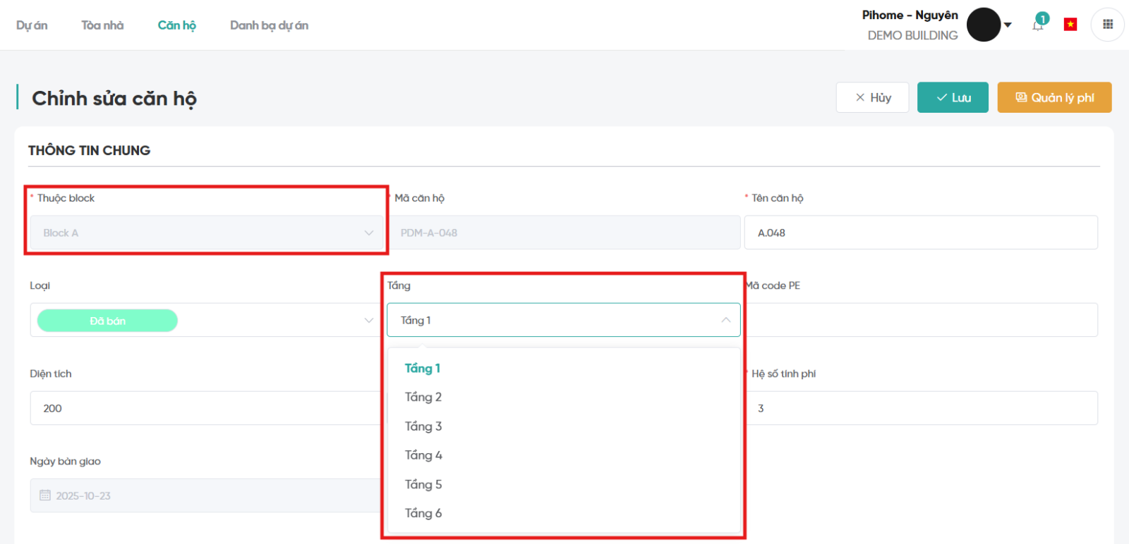 Trong giao diện Chỉnh sửa căn hộ, mục Tầng sẽ hiển thị danh sách các tầng đã được thiết lập để chọn.