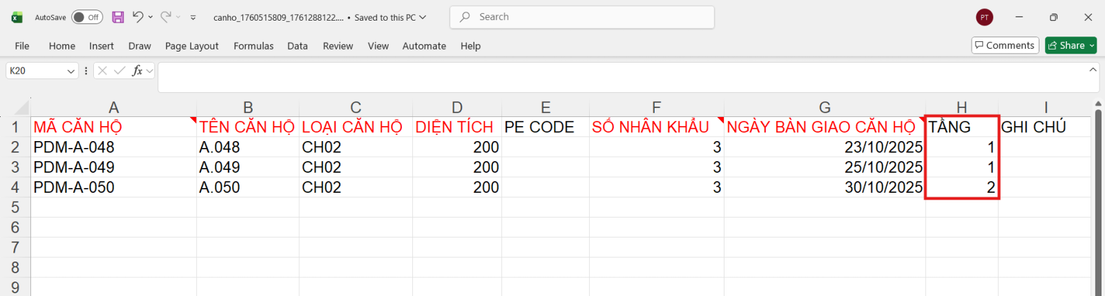 Sau khi đã có cài đặt về cấu trúc tầng, người dùng điền “Mã” tầng để có thể import dữ liệu căn hộ bằng file Excel: