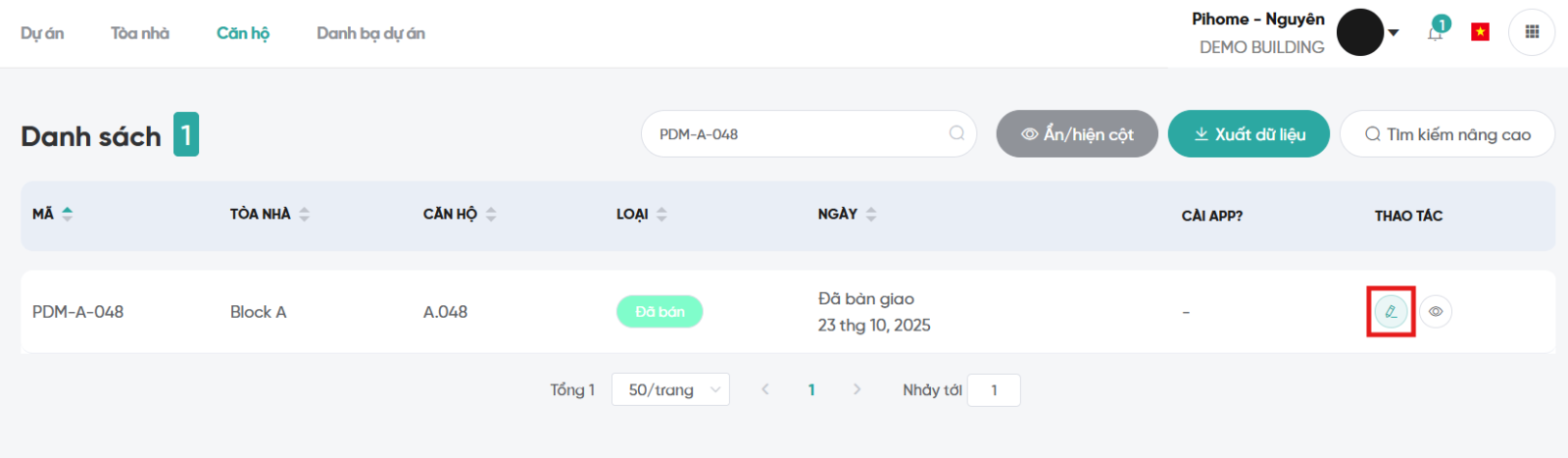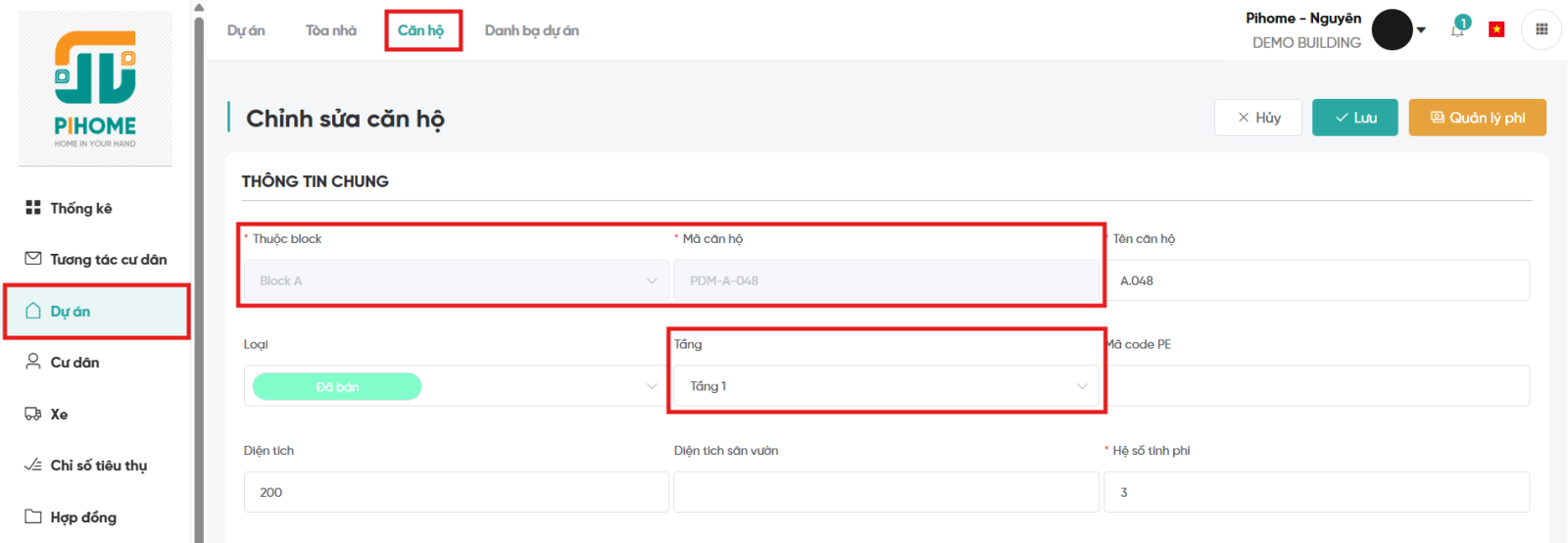Chỉnh sửa tầng của căn hộ trực tiếp tại phân hệ “Quản lý” → Vào “Dự án” → Chọn “Căn hộ” → Chọn chức năng “Chỉnh sửa” (Biểu tượng bút chì).
