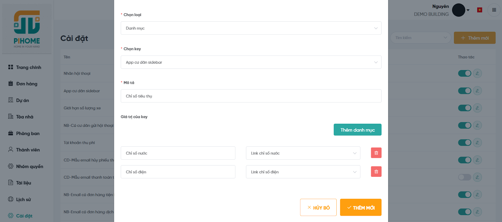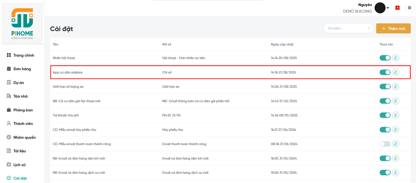 Khi lưu thành công, thông tin danh mục sẽ hiển thị trong danh sách cài đặt và danh mục vừa tạo sẽ hiển thị trong danh sách menu sidebar của app Cư dân (PiHome Pro).