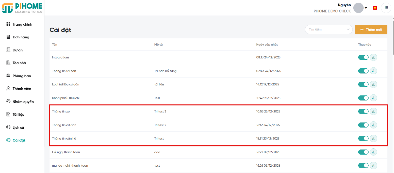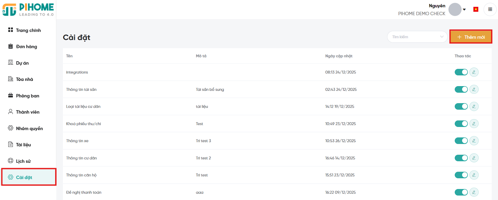 Khi lưu thành công, thông tin cấu hình xuất hiện trong Danh sách Cài đặt và có thể bật/tắt hoặc chỉnh sửa bất cứ lúc nào.