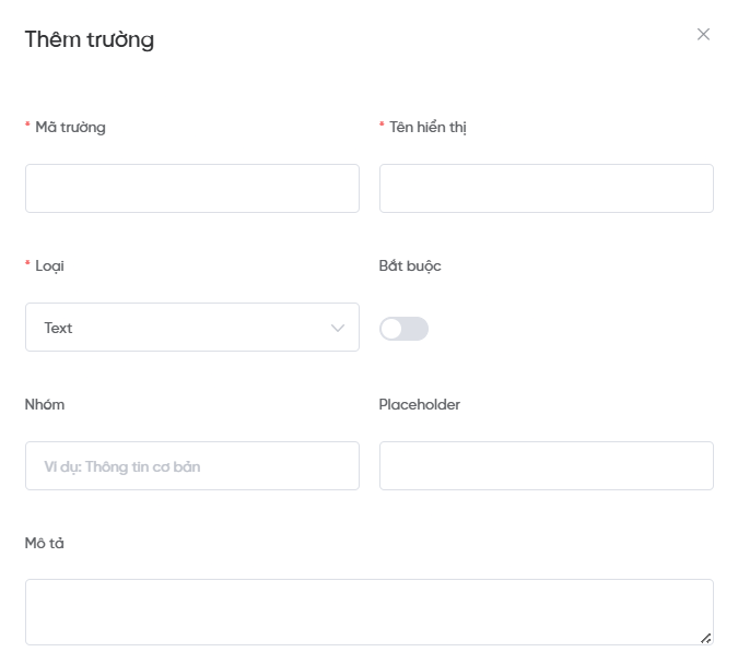 - Nhóm: Dùng để phân nhóm các trường dữ liệu khi hiển thị trên giao diện (ví dụ: Thông tin cơ bản, Thông tin cá nhân, Thông tin bổ sung…).