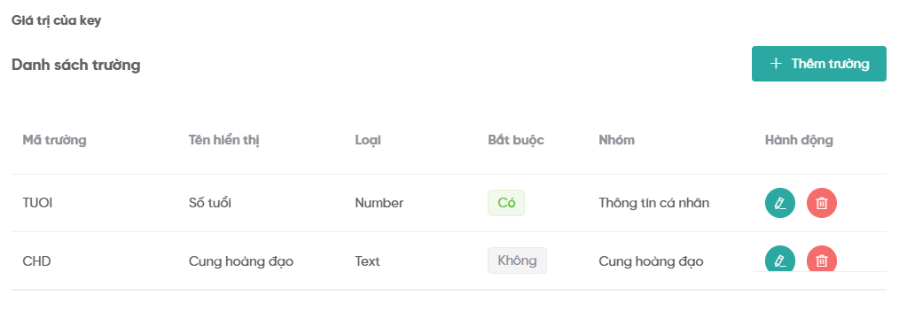 Bước 5: Sau khi nhập đầy đủ thông tin trường, nhấn “Lưu”. Danh sách trường động sẽ cập nhật trường mới.