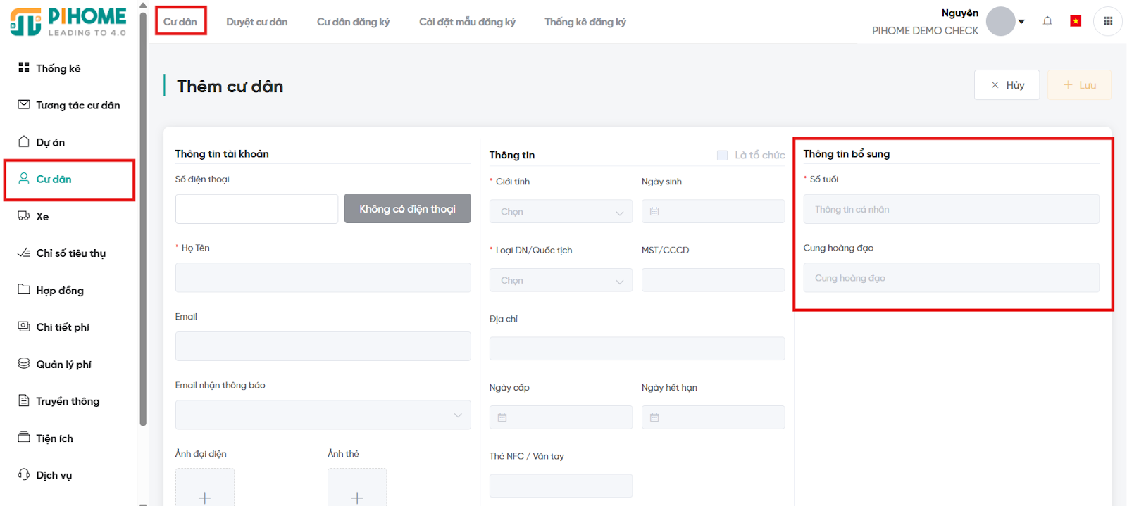 Sau khi hoàn tất thiết lập, tại các chức năng tương ứng (ví dụ: Cư dân, Căn hộ, Xe, Tài sản), hệ thống sẽ tự động hiển thị các trường dữ liệu bổ sung đúng theo cấu hình đã thiết lập. Ban Quản Lý có thể kiểm tra bằng cách: